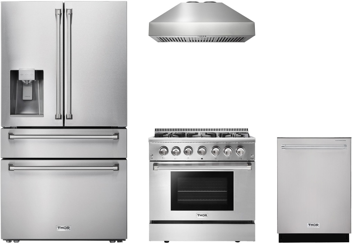 Thor Kitchen® 4 Piece Stainless Steel Kitchen Package with a freestanding dual fuel range, French door refrigerator, wall mounted range hood and built in dishwasher.Read More