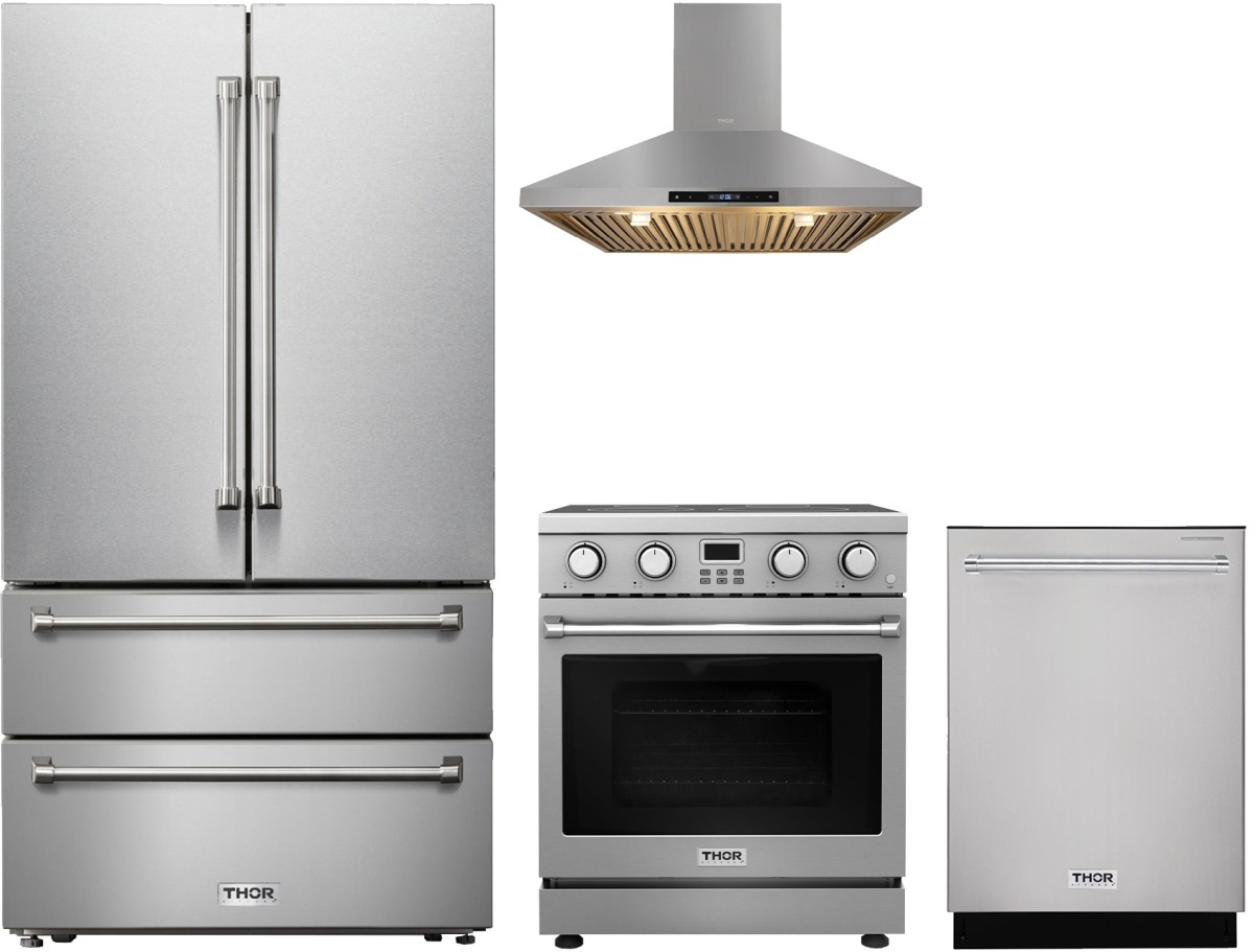 Thor Kitchen® 4 Piece Stainless Steel Kitchen Package with a freestanding electric range, French door refrigerator, built in dishwasher and wall mounted range hood.Read More