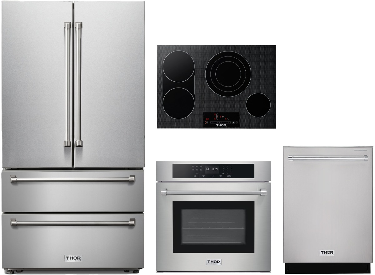 Thor Kitchen® 4 Piece Stainless Steel Kitchen Package with a French door refrigerator, single electric wall oven, built in dishwasher and electric cooktop.Read More